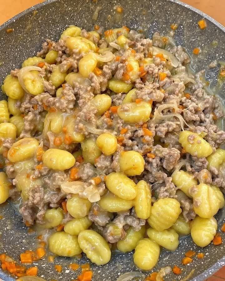 4. Appena gli gnocchi vengono a galla, scolali direttamente nella padella con il ragù. Spegni il fuoco e aggiungi una generosa manciata di grana e pecorino.