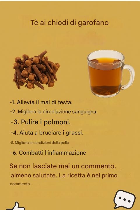 5-6 chiodi di garofano 1 tazza di acqua tiepida Facoltativo: un po' di miele o limone per addolcire il sapore Preparazione: Far bollire l'acqua. Aggiungere i chiodi di garofano e lasciarli in infusione per 10-15 minuti. Filtrare e gustare caldo, preferibilmente al mattino o dopo un pasto.