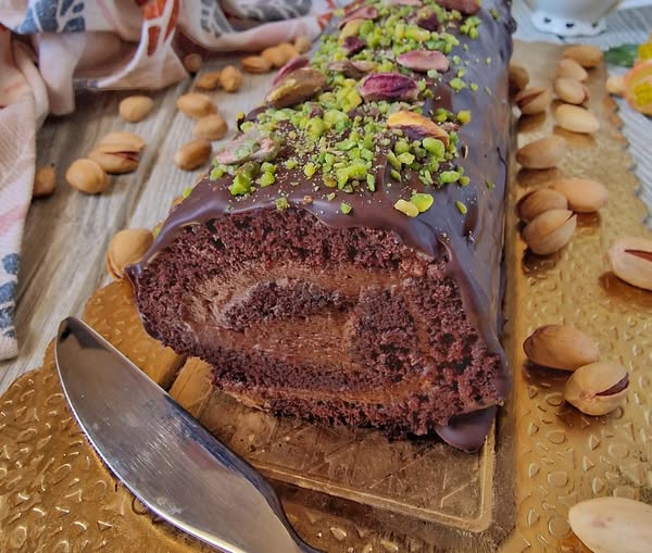 Riprendete il rotolo, trasferire in un vassoio e coprire con il cioccolato fuso e spargere la superficie con la granella di pistacchio e pistacchi interi, lasciare rassodare per mezzâora in frigo.