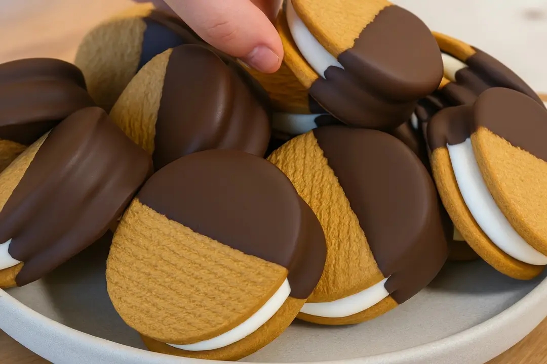 Montate la panna e aggiungete il latte condensato. Farcite i biscotti e metteteli in freezer per 6 ore. Sciogliete il cioccolato e immergetevi metà di ogni biscotto gelato.
